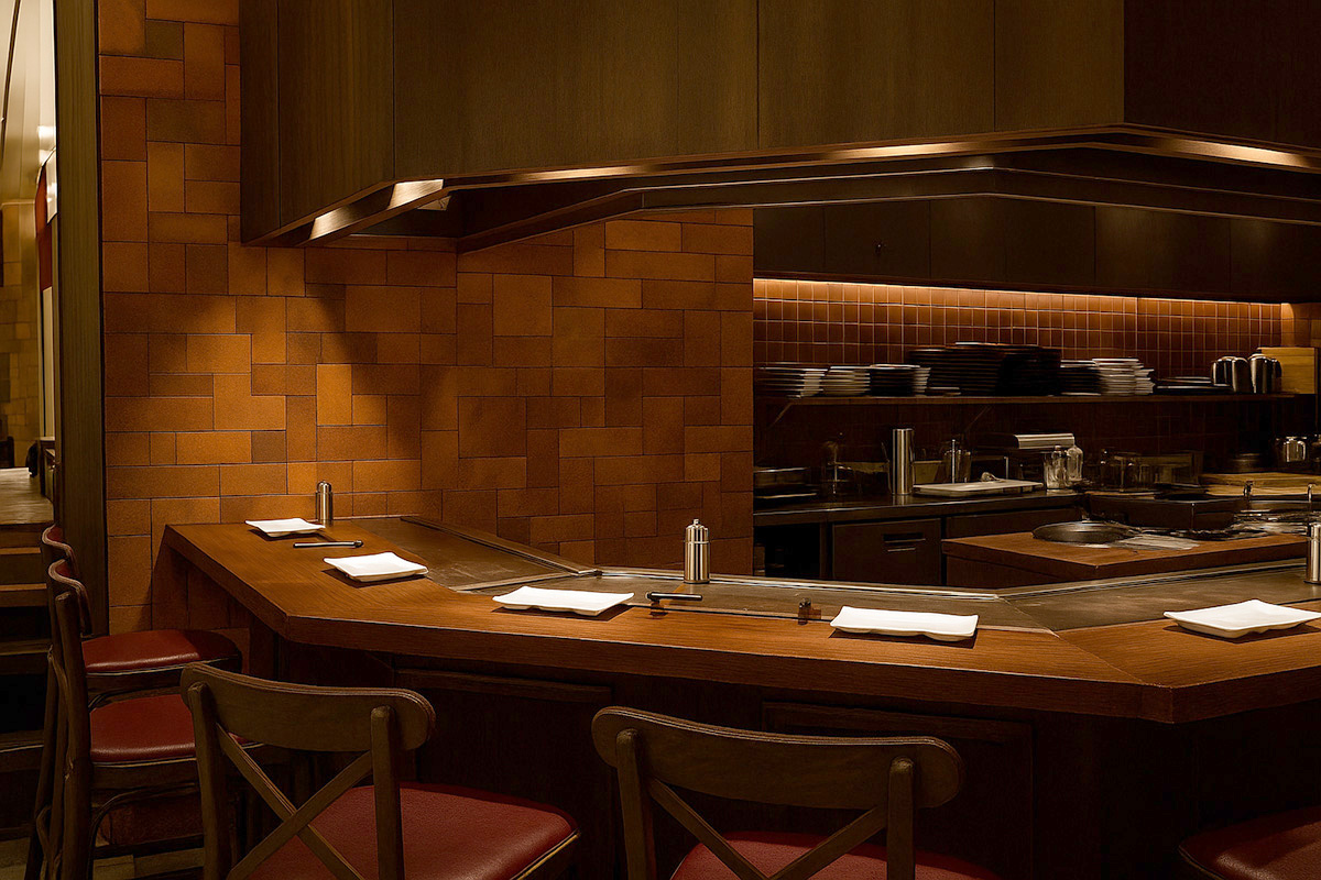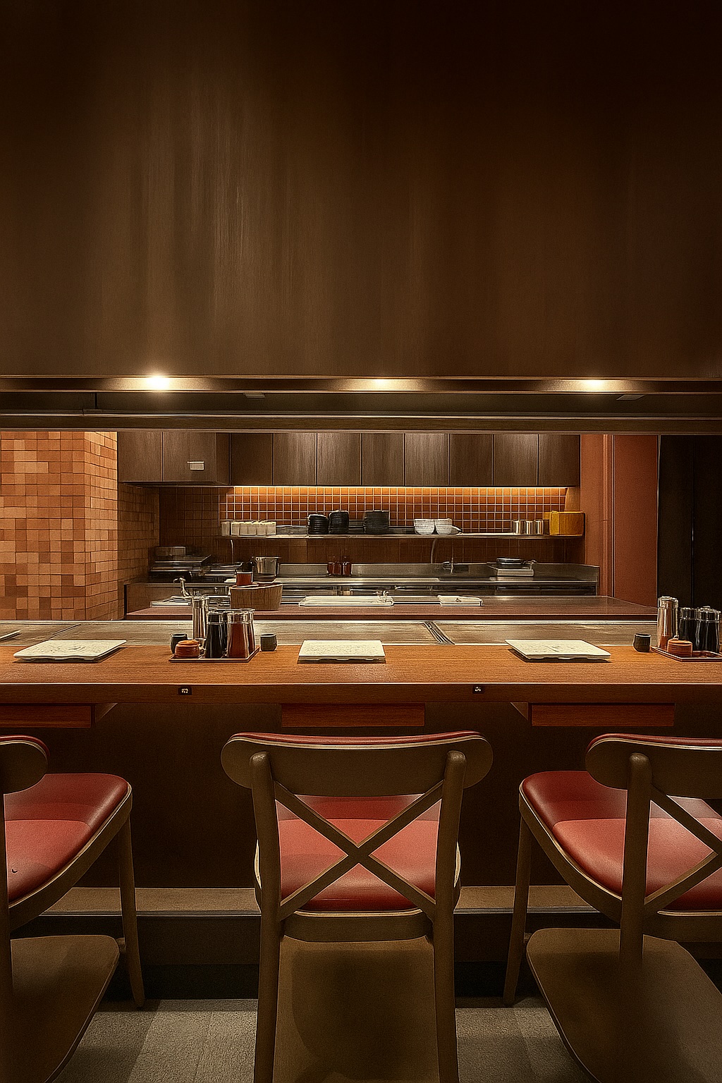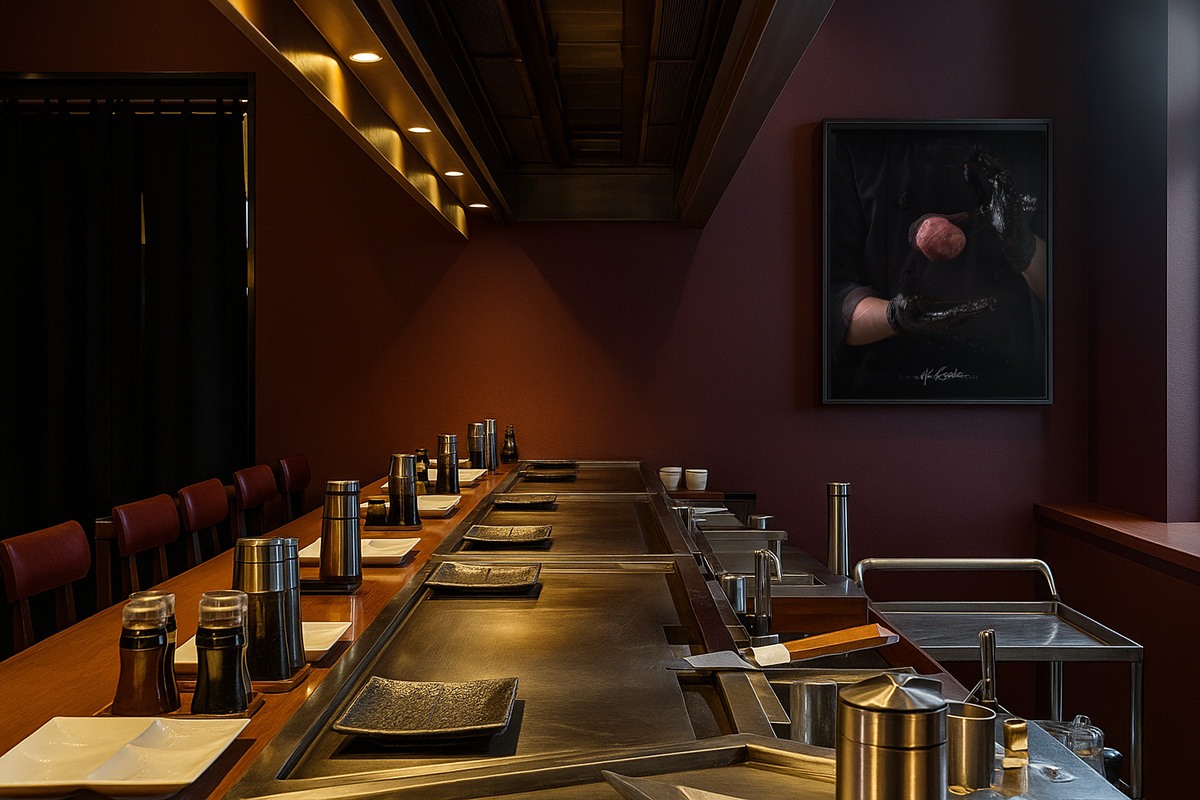 食の楽しさを五感で体感できるよう、空間全体の構成から鉄板焼き台の寸法、照明計画に至るまで、